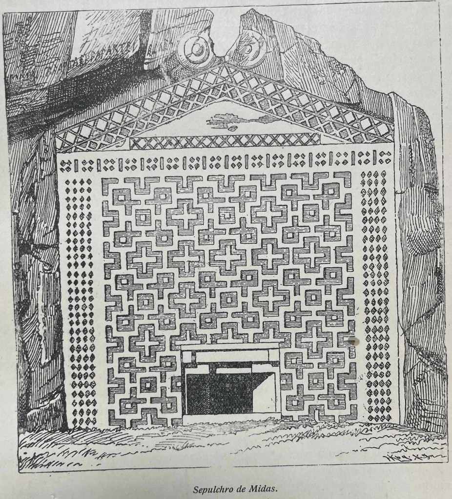 It was during a recent deep dive into an old, leather-bound, 20-volume series titled Historia Universal de Guilherme Oncken – a magnificent 19th-century universal history – that I stumbled upon a truly thrilling discovery. On page 15 of Volume 2, illustrating the “Sepulchre of Midas,” I found not a burial mound as I might have expected, but a striking image: the front of a temple carved directly into a natural rock formation. What immediately captivated me were its elaborate symmetrical cross-like structures and intricate geometric patterns covering the entire façade.